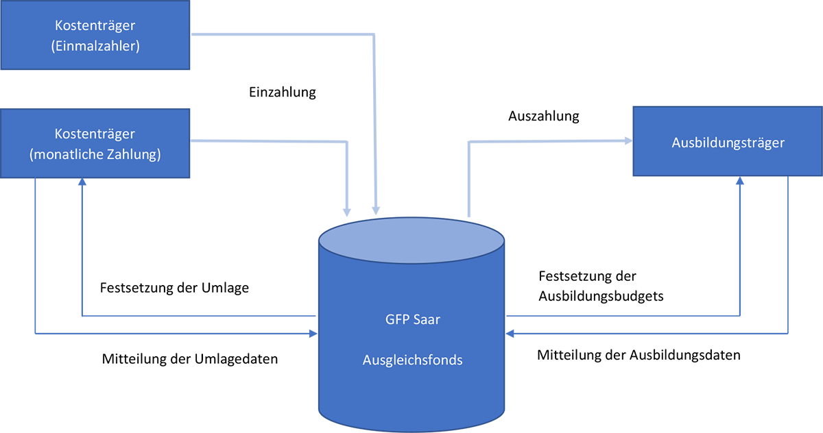 Der Ausgleichsfonds wird von der GFP Saar verwaltet. Im Finanzierungsjahr zahlen die Einrichtungen ihren Umlagebetrag zum 10. eines Monats, die Träger der praktischen Ausbildung und die Pflegeschulen erhalten ihre Ausgleichszuweisung am Monatsende. Grundlagen für das Verfahren sind das Pflegeberufegesetz (PflBG) und die Pflegeberufe-Ausbildungsfinanzierungsverordnung (PflAFinV).