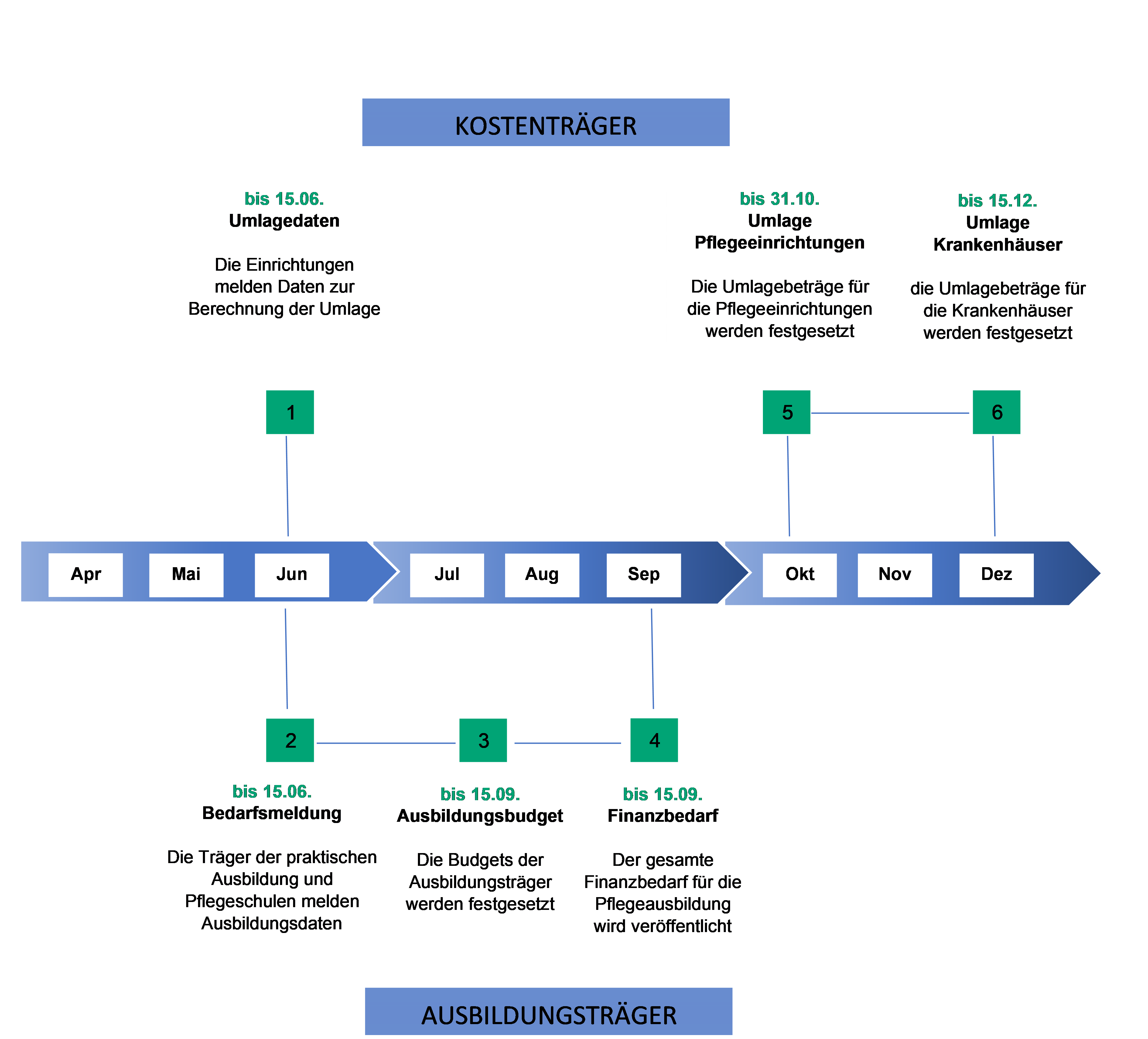 Der Umlagebetrag wird für jede Einrichtung individuell berechnet und für die stationären und ambulanten Pflegeeinrichtungen bis zum 31. Oktober, für die Krankenhäuser bis zum 15. Dezember festgesetzt.